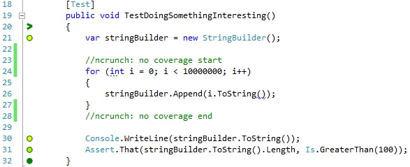 - If you wish to improve the performance of a selective region of code under test. As NCrunch's instrumentation adds weight to the code, turning it off for frequently executed lines can improve test performance.